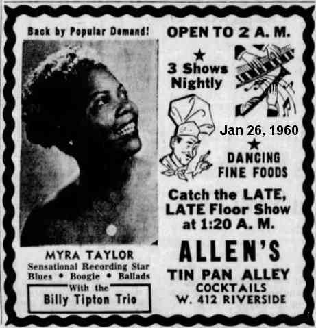 In late January 1961, she was at the Ho-Ti, in Portland, Oregon, but there were no ads. In early March, she was back at Allen's Tin Pan Alley.