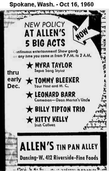 1956 started with Allen's Tin Pan Alley, in Spokane, Washington for the week beginning February 27. Three years previously, she'd been at Allen's Theatre Room, which might have just been re-named.
