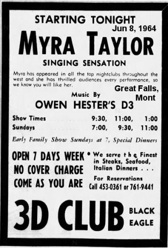 Next was the 3-D Club, in Great Falls, Montana, from February 16-21. (This time the ad said she "Sings Everything From Bach To Boogie", but I'm not aware of any Pop songs that Bach wrote.) On March 23, she started two weeks at Kirkpatrick's Boulevard in Coeur d'Alene, Idaho. She was back at the 3-D Club from May 2-24. From there, it was the Ozark Club, also in Great Falls, for about two months. October 26, found her at the Lewiston Country Club, in Lewiston, Idaho, for a week. The ad said she'd been there before, but I can't find any previous ads.