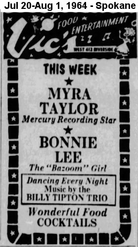 June 6 found her ("Mercury Recording Star") at the Elks Club in Wallace, Idaho. Two days later, she opened at the 3-D Club in Great Falls, Montana. From July 20 to August 1, it was back to Vic's in Spokane.