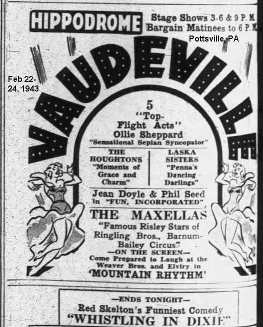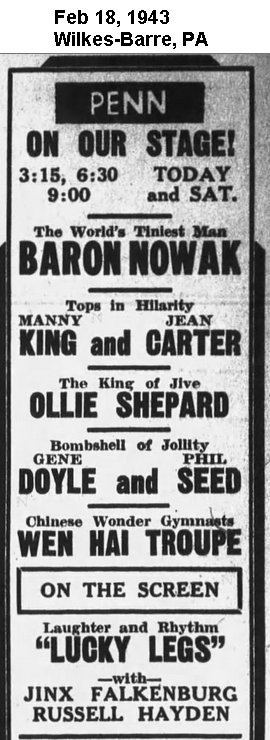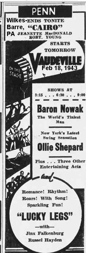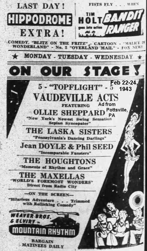 February 22-24, 1943 found Ollie at the Hippodrome in Pottsville, Pennsylvania. In March 1943, he was at Fay's in Providence, Rhode Island, but then disappeared for a year and a half.