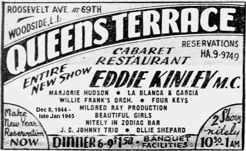 From December 8, 1944 to late January 1945, he was at the Queens Terrace Cabaret Restaurant in Woodside, Queens, New York. After that, he opened at the Blue Moon, Newark, New Jersey, on February 12.