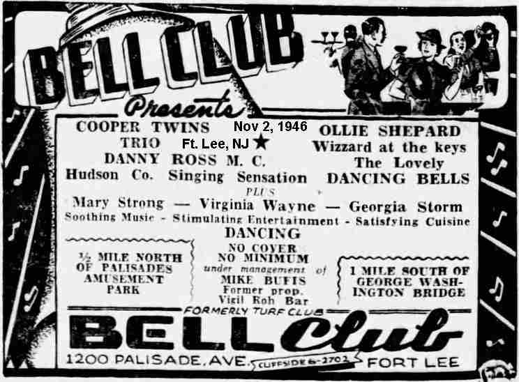 Another long stretch with no Ollie Shepard until he ("Wizard At The Keys") opened at the Bell Club in Fort Lee New Jersey on November 2, 1946. It couldn't have been a long engagement, since the club had recently re-opened after having been shut down for liquor violations, and, by November 14, had been shut down again.