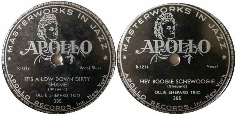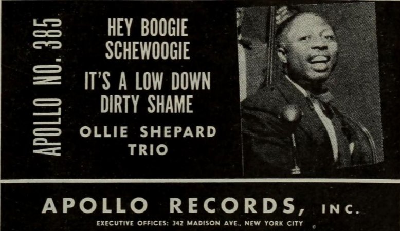 The May 29, 1947 Billboard reported that "Blues-chanter-pianist Ollie Shepherd [sic] signed to wax with Apollo diskery." They were a bit late; his sole Apollo record, "Hey Boogie Schewoogie", coupled with a second recording of "It's A Low Down Dirty Shame" had already been released in April. The label credited it to the Ollie Shepard Trio, although the signing announcement only mentioned his name. However, a big ad for it has a cropped photo of Ollie, with a bassist behind him, so there may have actually been a trio for a while. If so, there are no appearance ads for them and no member names. (Actually, I can hear some other echoing voices on "Hey Boogie Schewoogie".)