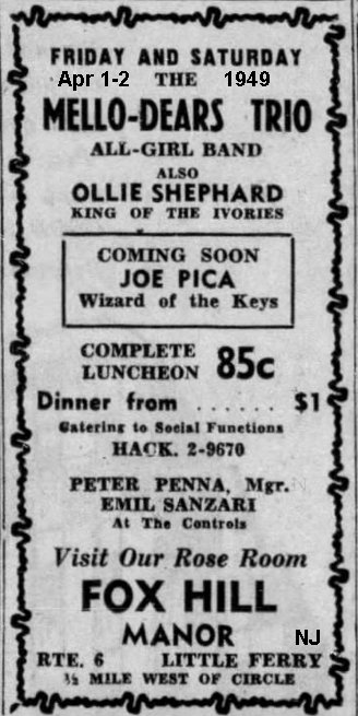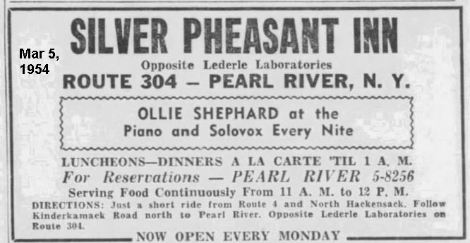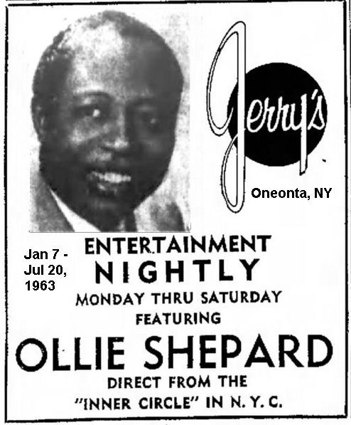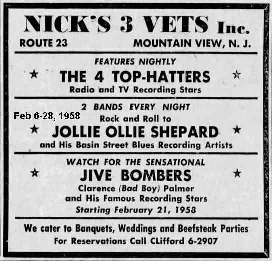 From February 6-28, 1958, "Jollie Ollie Shepard [as he was now calling himself] and His Basin Street Blues Recording Artists" (whatever that meant) were at Nick's 3 Vets in Mountain View, New Jersey.