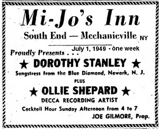 On July 1, 1949, Ollie started a week at Mi-Jo's Inn in Mechanicville, New York.