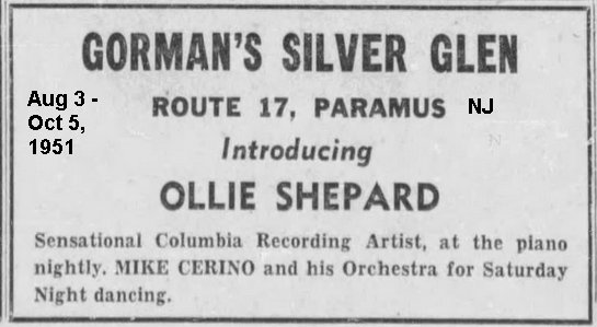 From August 3 to October 5, 1951, Ollie was at Gorman's Silver Glen in Paramus, New Jersey.