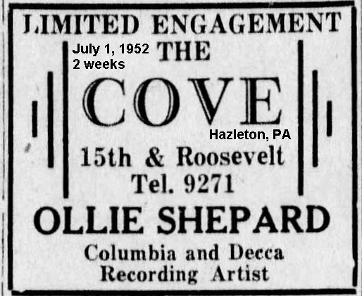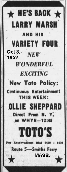 On July 1, 1952, Ollie started two weeks at The Cove in Hazleton, Pennsylvania. On October 8, 1952, he began a stay at Toto's in Smiths Ferry, Massachusetts for an unknown period.