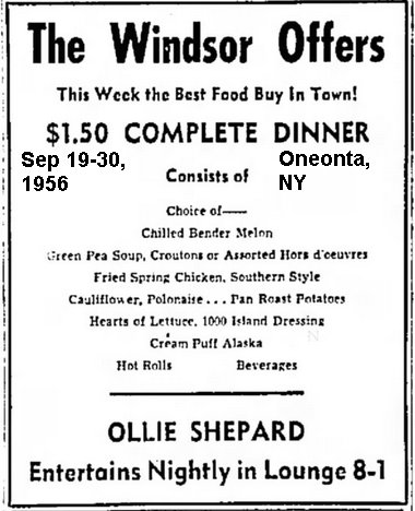 The April 21, 1956 New York Daily News reported that Ollie was at the Red Carpet, presumably in Manhattan. From September 19-30, 1956, Ollie appeared at the Windsor, in Oneonta, New York.