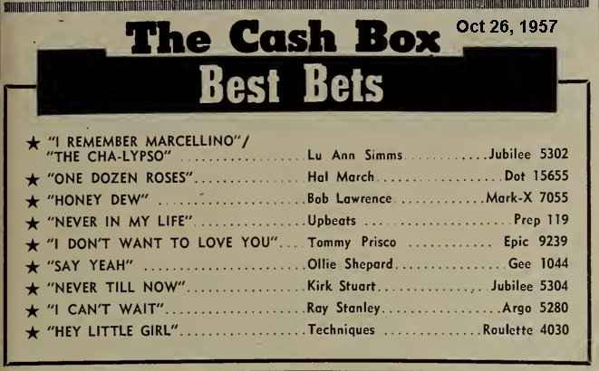 September 1957 saw the release of "Say Yeah" and "My Babe Is Gone" on New York's Gee Records. By this time, original owner George Goldner had sold the label to Morris Levy.
