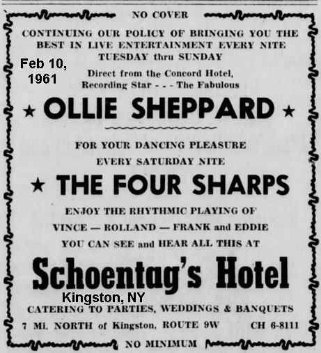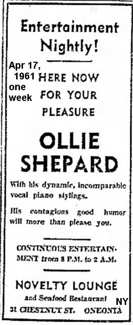On February 10, 1961, Ollie started at Schoentag's Hotel in Kingston, New York, in the Catskills. The ad said he'd come from the Concord Hotel, one of the big area resorts. (However, this wasn't prime Catskills season, which was in the summer.) On April 17, 1961, he began a week at the Novelty Lounge in Oneonta, New York.