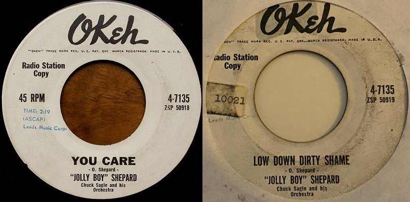 Nothing more until August 1960, when Okeh gave him one more chance. "You Care" and a third stab at "Low Down Dirty Shame" were released as by "Jolly Boy" Shepard. They were reviewed in the August 13, 1960 Cash Box, both receiving a "B":