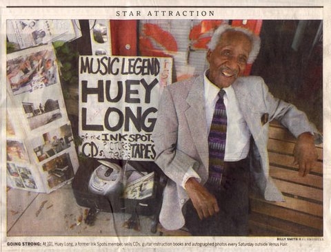 I think that Huey finally became home sick for New York, and departed with his pianist. Here he devoted his time to teaching the intricate chord melody style that is so beautiful. Wish I was proficient enough to grasp it. He moved back to Houston around 1996 in order to be closer to his family, but tragedy struck him with the death of a son he was planning to live with. He has very devout beliefs that no doubt helped him to settle in Houston. If you ever go to Houston, be sure to visit the Ink Spots Museum that is run by his daughter, Anita at 117 East 20th Street, Houston TX 77008, 713-677-9736. She sells photos, tapes, and guitar courses. Duke Ellington coined the phrase "Music Is My Mistress," but I feel that my friend Huey Long personifies it more aptly than any other musical icon today. Huey passed away on June 10, 2009 in Houston. |