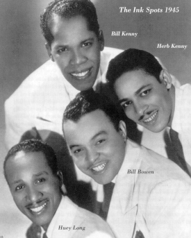 While playing at the Three Deuces Cafe in March of 1945, Huey was approached by Bill Kenny to join the Ink Spots. Regular guitarist Charlie Fuqua was in the Army, and Bill wanted Huey to replace Bernie Mackey who was filling in for Charlie. Huey told me that he and Herb Kenny joined at the same time and first appeared at the Paradise Theater in Detroit (the Ink Spots appeared there 29Mar-5Apr/45). He also said that Bill Kenny only wanted him to comp, not do the opening vamp, and add vocal support to the group. The Spots had not recorded anything since February of 45, and the new line up turned out "I'm Gonna Turn Off The Teardrops and I'll Lose A Friend Tomorrow" on 10/2, "The Sweetest Dream and Just For Me" on 10/3. They also did "Keep On The Sunny Side" which was never released, but a test pressing survives. Fuqua returned unexpectedly one night (on 26 Oct/45 at Glenn's Rendevous, Newport, KY) to take over his spot, which ousted Huey.