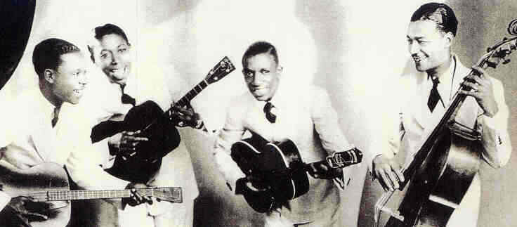![]() Jerry Daniels with a four stringed tenor guitar, Deek Watson with a tenor guitar, Charlie Fuqua with a guitar and Hoppy with his cello strung like a bass. |