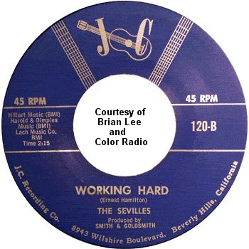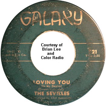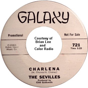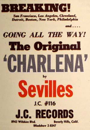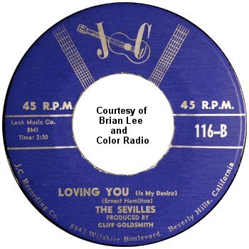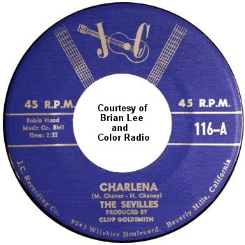The first song the Sevilles recorded was "Charlena," which had been written by Manuel Chavez and Herman "Sonny" Chaney of the Jaguars (it was a tune that the Jaguars had tried, without success, to get recorded for over a year). Cliff Goldsmith liked it and set up the session (which also had Manny Chavez playing guitar on the very day that he had to report for military duty). Strangely, the only voices you hear on most of the record were those of Ernest Hamilton, James Spencer, and Charles Smith singing three-part harmony. Leroy Hicks mostly stood around doing nothing until the end, when he threw in some spoken comments. (This odd formula would be repeated on two other Sevilles songs: "Salt Mine" and "Louella.") The flip side, led by Ernest, was "Loving You (Is My Desire)."