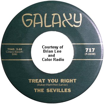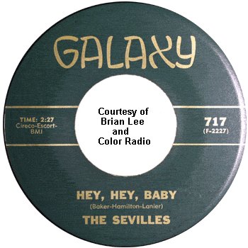 Nothing happened with this platter either, and the Sevilles finally fell apart (Leroy Hicks and Charles Smith went to some other group and James Spencer turned to gospel). But a year later, Ernest Hamilton decided to try again. Getting his old Paramounts buddies, Bobby Baker and James Lanier, the revamped Sevilles trio recorded "Hey, Hey, Baby" and "Treat You Right" (both with three-part harmony) for the Galaxy label (a subsidiary of Fantasy Records, with Cliff Goldsmith as A&R man). The session pianist was Jennell Hawkins (born Jennell Brown, she'd recorded some duets with Richard Berry as "Ricky & Jennell" and had been a member of the Kuf-Linx after their recording days).