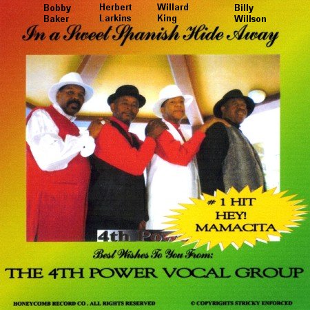 James Lanier closes with: "We all began to go our own separate ways. We started our own families, but stayed in touch through the years. Today Bobby, Ernest, and I are back together again making music and you can bet your last dollar we have not missed a beat with our new songs as the 4th Power Vocal Group." [NOTE: The 4th Power Vocal Group is a loose conglomeration of singers. Says James: "It changes personnel from time to time. it all depends who's avaliable, but the original members in the photo are, from left to right: Bobby Baker, Herbert Larkins, Willard King (brother to Melvin King, who was the bass in the original Olympics), and Billy Willson." In 2009, they released a CD called "In A Sweet Spanish Hide Away," on Honeycomb.]