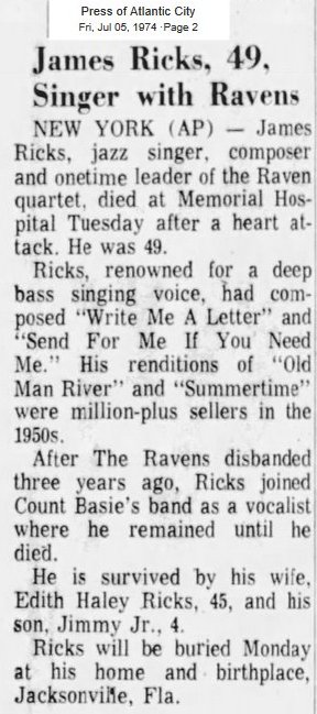 After he left the Ravens in 1955, Jimmy Ricks did mostly solo work for the rest of his career. He made many recordings, but without much success, through the end of the 60s.