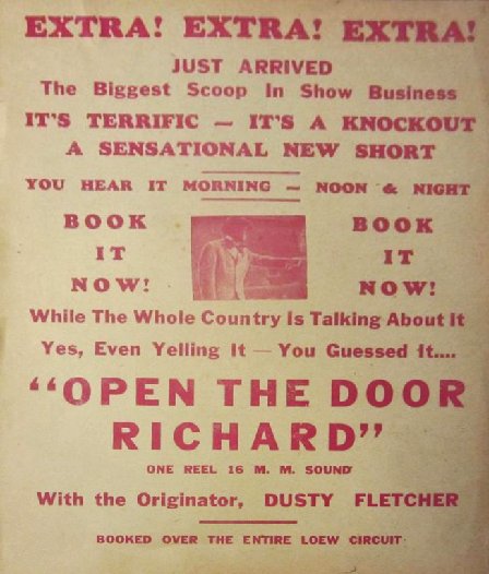 In a blurb in the December 28, 1939 Pittsburgh Post-Gazette, Dusty Fletcher is called the "originator of the comedy scene, 'Open That Door Richard'." The first advertisement that associated it with him was for Pittsburgh's Casino Theater, on December 30, 1939. A January 2, 1940 article in the Pittsburgh Press said that Fletcher had performed "Open That Door, Richard" as far back as 1930, when he (and it) were in the 1930 edition of Lew Leslie's "Blackbirds" (along with Ethel Waters, Mantan Moreland, Jimmy Baskette, the Berry Brothers, and Eubie Blake). However, I've looked through the entire program for that show when it played the Royale Theater in New York and he was never separately named, nor was there any routine that could have been "Richard". His name appears in the show's program when it transferred to the Chestnut Street Opera House (Philadelphia) in January 1931, but I can't see the skit listings in that one. Actually, since the February 21, 1931 New York Age said (talking about the new "Lucky To Me" revue at the Lafayette Theater): "This cast includes .... Dusty Fletcher (who succeeded Flournoy Miller as the main comedian of Lew Leslie's Blackbirds)....", it's possible that he did the routine in Philadelphia, but wasn't in the in New York production.