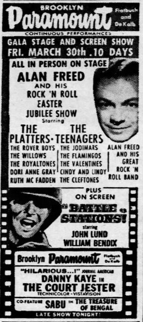 Right away, we signed to do the Alan Freed show at the Brooklyn Paramount. We thought we were on our way. The headliners were Frankie Lymon and the Teenagers, the Platters, the Flamingos, the Solitaires, the Cleftones, the Willows, Fats Domino, the Valentines, Ruth McFadden, and many more. [EDITOR'S NOTE: others were the Rover Boys, the Jodimars, Cindy & Lindy, Dori Anne Gray, and the Alan Freed Orchestra with Sam "The Man" Taylor and Big Al Sears. The show began on March 30.] We were really on cloud nine. Nothing could stop us now, we thought. That was one of the best shows I think they ever had - the crowd was unbelievable.