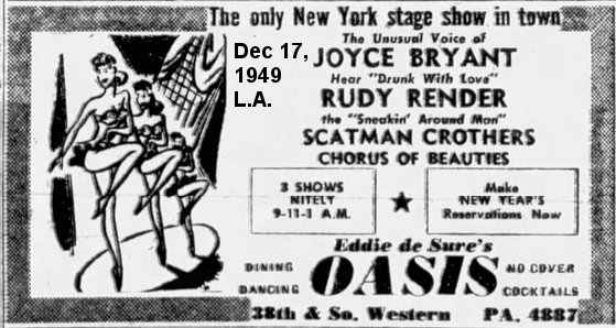 But fame is a slippery thing. The December 8 Los Angeles Daily News, in Ray Hewitt's Spotlighter column said: "Next Tuesday [December 13], Rudy Render, whose recording of "Slippin' Around [so close]" is such a hit, and Joyce Bryant will be added to the show [at the Oasis]."