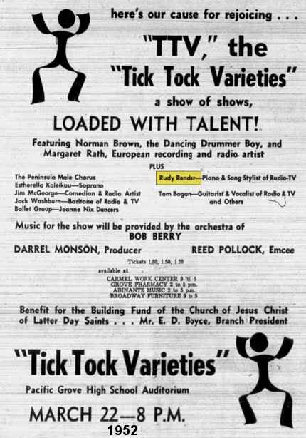 March 22, 1952: at Pacific Grove High School Auditorium in "Tick Tock Varieties"