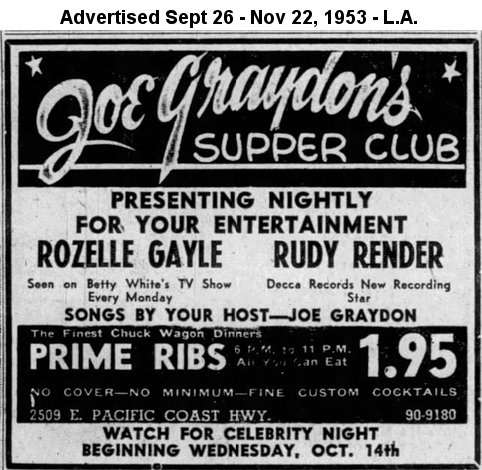 Sticking around Los Angeles, Rudy was advertised at Joe Graydon's Supper Club between September 26 and November 22, 1953.
