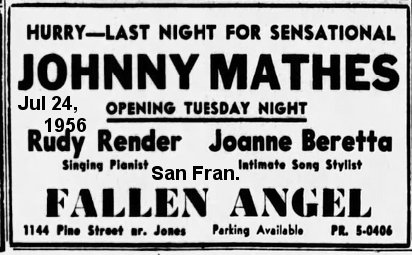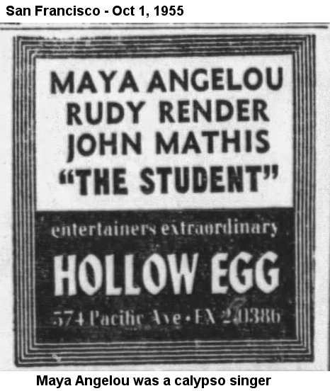 On September 30, 1955, Rudy started at the Hollow Egg in San Francisco. Also on the bill was Maya Angelou (a calypso singer) and a new talent named John Mathis (I'll go out on a limb and predict big things for him).