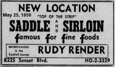 On March 30, 1956, Rudy (sans trio) and the Red Norvo Trio opened at the Desert Inn, in Palm Springs, California. On May 19, it was the Versailles Room (soon to be renamed the Saddle And Sirloin) on Sunset Strip. On July 24, he opened at the Fallen Angel in San Francisco. Then, on October 12, it was back to the Desert Inn. Presumably that was a short engagement, since the Desert Inn's November 7 ad said that the "Rudy Render Duo" was playing a return engagement. (No idea who the other half of the duo was.) On November 21, he (but no duo) opened at Malcoff's Stein And Sirloin in Phoenix. By early December, he was back at the Desert Inn. Rudy was certainly keeping busy.