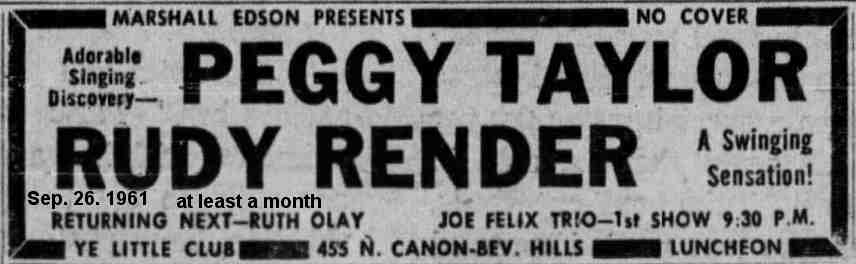 On April 24, 1961, Rudy started at Ye Little Club in Beverly Hills. In early May, said the May 9 Morristown Gazette-Mail: "Debbie Reynolds and Harry Karl [her current husband] took 20 people to hear singer Rudy Render at Ye Little Club. Rudy does arrangements for Debbie."