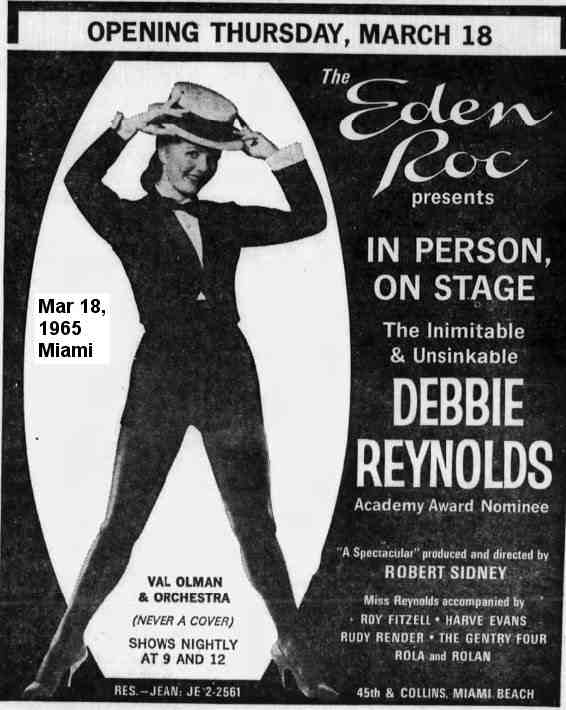 There was nothing at all about Rudy in 1964, but when Debbie opened at the Riviera in Las Vegas on January 21, 1965, he was mentioned as the conductor of the Jack Cathcart Orchestra. He was also in the ad when she opened at Miami's Eden Roc on March 18. He and Debbie were back at the Riviera, for six weeks, starting December 20, 1966, and again at the Eden Roc in February 1967 (when he was conducting the Val Olman Orchestra).