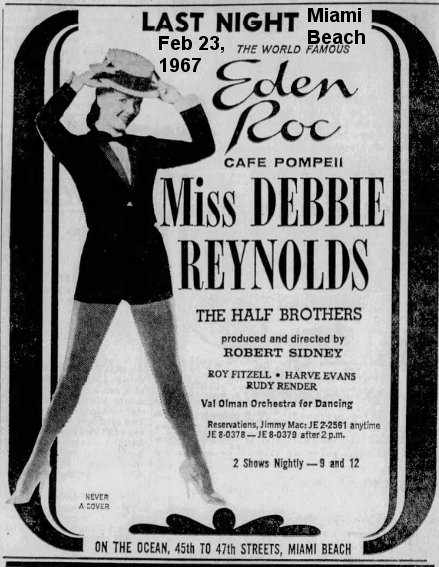 Debbie returned to the Riviera on March 7, 1967 for four weeks. Rudy was, once again, conducting the Jack Cathcart Orchestra. But this was the last time he was mentioned with her. At this point, she turned to TV and movie work, not live appearances.