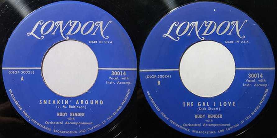 A short while later, Adams, who supervises the careers of such noted artists as Louis Jordan ..., signed young Rudy Render to make a waxing for London Records. The platter, labeled "Sneaking [sic] Around", is rated No. 6 on Billboard's record poll. Currently, Adams is prepping the youngster for a nation-wide tour with bookings in leading night clubs.