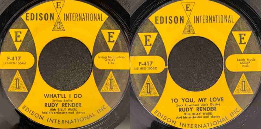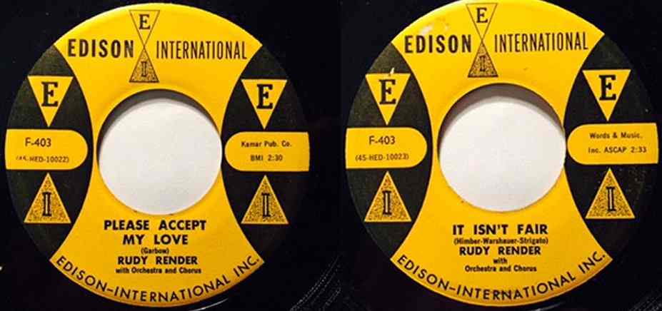 Cash Box: Chances are Edison International's gonna have its first national chart outing in this release that spotlights the wonderful vocal talents of newcomer [?] Rudy Render. It's an oldie-newie combination with Gary Russell's ork supplying the thrilling rock-a-ballad musical backdrops. "These Foolish Things" is the magnificently-revived durable and "This Above All" is the beautiful new entry. Rudy's soft, rich interpretations (a la Brook Benton) of these two tunes are a listening treat.