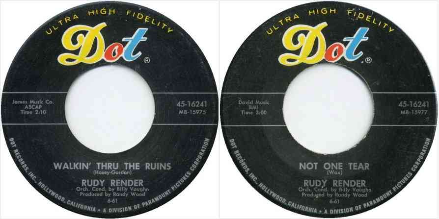 Rudy's last record release was "Not One Tear" (my favorite), backed with "Walkin' Thru The Ruins", on Dot, from June 1961. They were reviewed in the July 22 Cash Box: