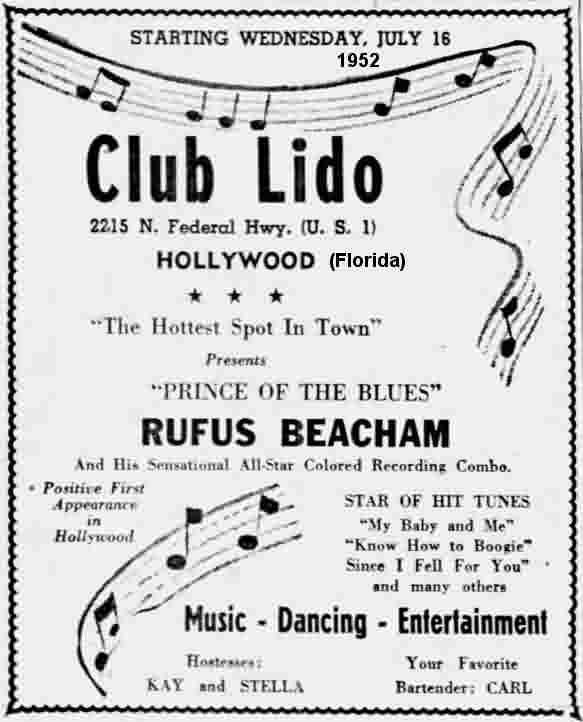 Finally, an ad. On July 16, Rufus Beacham, "Prince Of The Blues - And His Sensational All-Star Colored Recording Combo" appeared at the Club Lido in Hollywood, Florida. The July 16 newspaper ad named three of his songs: "My Baby And Me", "Since I Fell For You", and "Do You Know How To Boogie", as well as "and many others". Note that, since the second two would only be released that month, it's probable that a press agent supplied the titles. [Once again, "All-Star" in ads like this has no meaning whatever.]