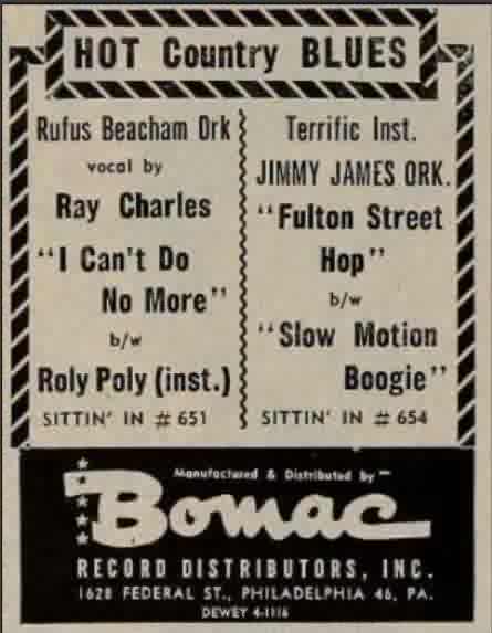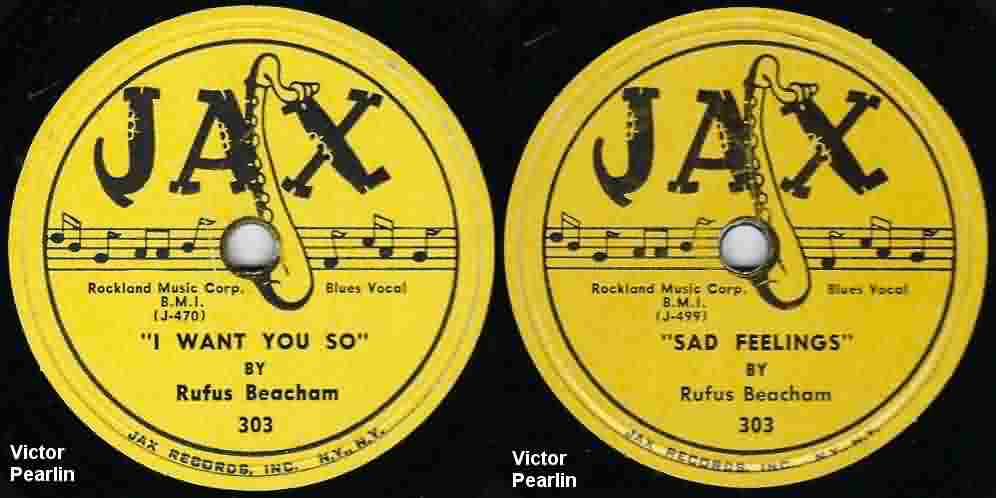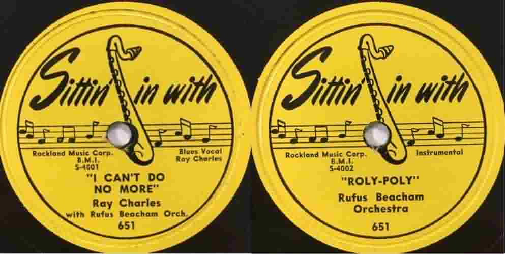 The next Jax record, from September 1952, was the pretty ballad "I Want You So", backed with "Sad Feelings", both with nice sax work. That same month, Sittin' In With issued two sides by the "Rufus Beacham Orchestra": the instrumental "Roly-Poly", coupled with "I Can't Do No More", with the vocal by Ray Charles.