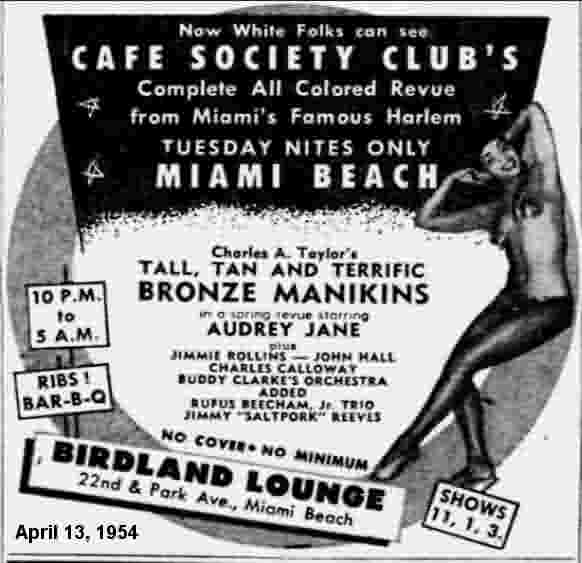 After that, they got an engagement at the Cafe Society Club in Miami. It must have done very well, since, by April 13, it was also playing at the all-white Birdland in Miami Beach on Tuesday nights. The April 13 Miami News said: "All Negro Cafe Society club show presents full revue at Birdland, Miami Beach. Bronze Manikins with Audrey June, Jimmy Rollins, John Hall, Charles Calloway and Rufus Beacham, Jr. trio plus Jimmy 'Saltpork' Reeves." A Birdland ad trumpeted "Now White Folks can see Cafe Society Club's Complete All Colored Revue from Miami's Famous Harlem". Each Tuesday night, through the end of April, there were three shows: 11 PM, 1 AM and 3 AM.