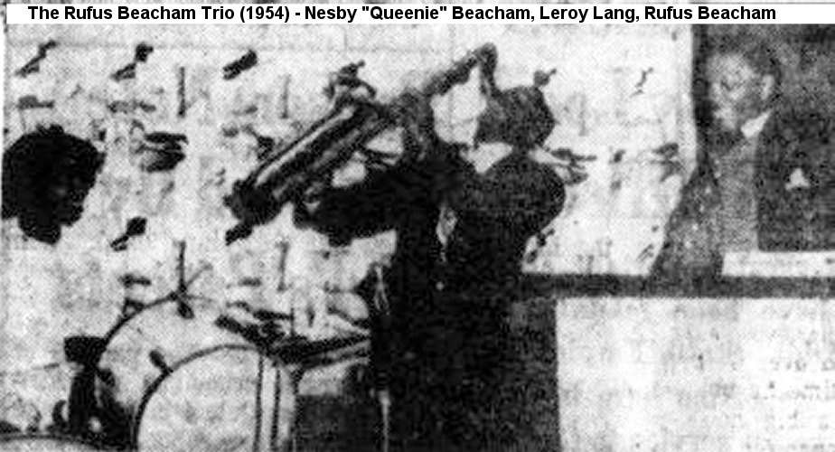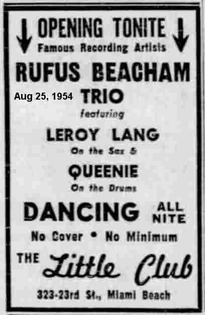 The 1954 Rufus Beacham Trio had Rufus on piano, Queenie on drums, and Leroy "Madman" Lang on sax. He'd had Leroy Lang & His Jazz Boys in June 1951. Late the next year, he'd have the Leroy Lang Orchestra, which recorded "Combo's Boogie" and "A Tenor Wails The Blues" for Henry Stone's Rockin' label. They were later called the Madmen Of Jazz or the Musical Madmen. In 1953, he'd been with Johnny Burdine & His Birdmen and some other small combos. I can't find out when he started with Rufus or when he left, but his name only appears in ads from August and September 1954 (he isn't mentioned again until June 1955, when he was appearing at Porky's Hideaway in Fort Lauderdale). Lang would go on to record with Louis Jordan, on Mercury, in 1958.