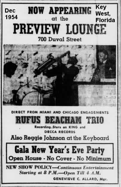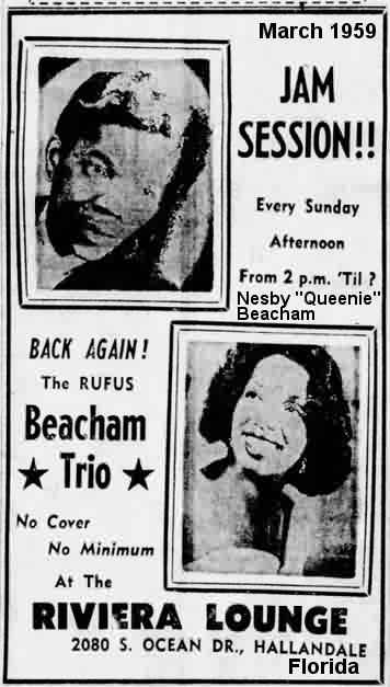 In March 1959 the Rufus Beacham Trio appeared at the Riviera Lounge in Hallandale, Florida. The ad pictured Rufus (in what seems to be the only publicity photo he ever took) and Queenie, but doesn't say who the third member is. The ad only ran once, on March 26 (although, in truth, there were very few ads for the Riviera at all). He was definitely gone by June.