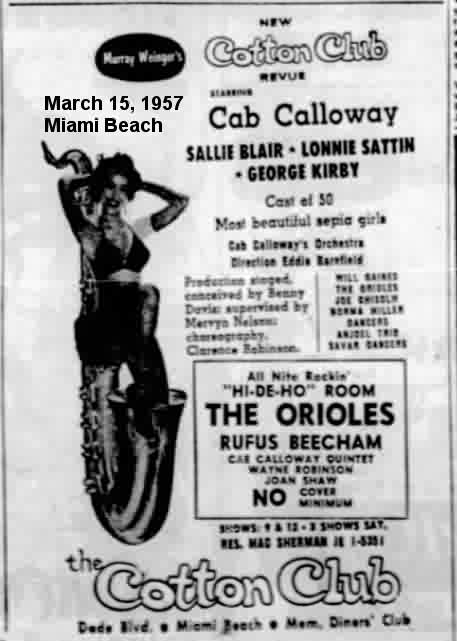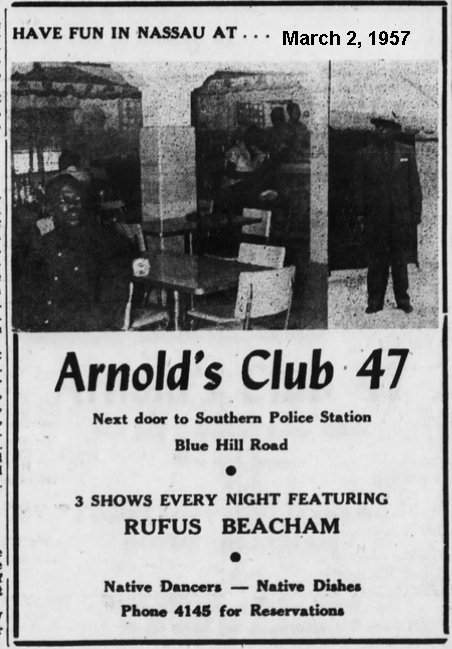 The only instances in which Rufus Beacham definitely left Florida were for a few early 1957 engagements in Nassau (Bahamas). For example, on March 2, he and Queenie opened at Arnold's Club 47. They were there for at least two weeks, still being mentioned on March 16.