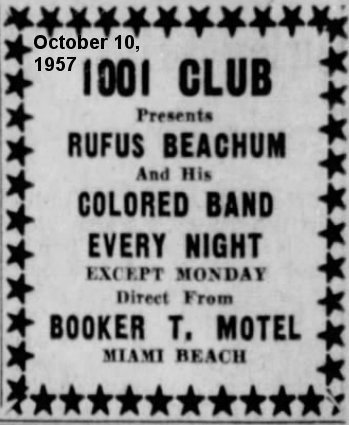 October 10, 1957 found "Rufus Beachum And His Colored Band" at the 1001 Club in West Palm Beach, Florida. The ad said they were direct from the Booker T. Motel in Miami Beach.