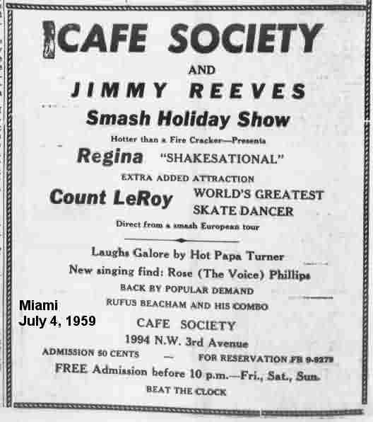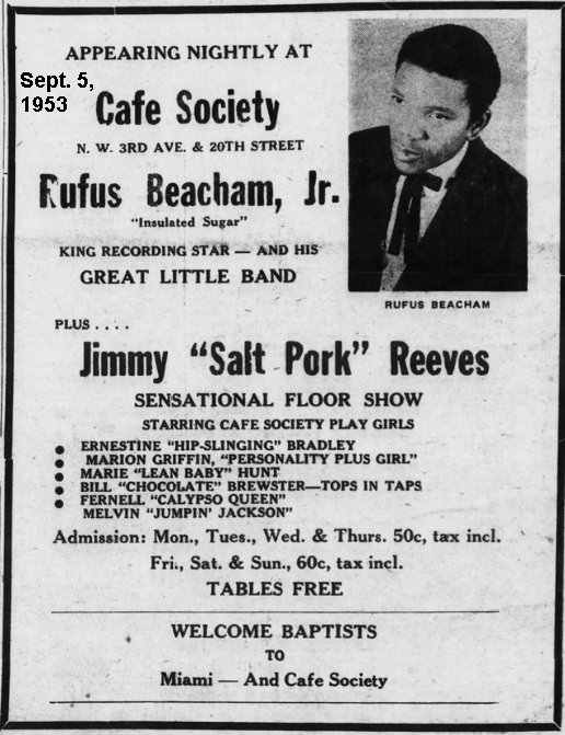 The February 8, 1958 Miami Times said "Don't miss the big show with former entertainers of Cafe Society Feb. 10. Music by Rufus Beacham and his new orchestra. Jimmie Reeves is presenting the fun." I'd certainly consider going, but they didn't bother to mention where it would be held.
