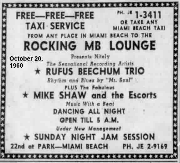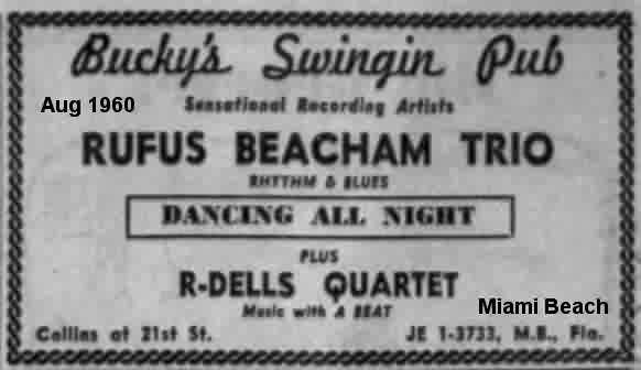 In August, the Rufus Beacham Trio played Bucky's Swingin Pub in Miami Beach. In October, it was the Rocking MB Lounge, also in Miami Beach (the ads said they were the "Rufus Beechum Trio" or the "Rufus Beachum Trio" - actually, not one MB Lounge ad ever spelled his name correctly).