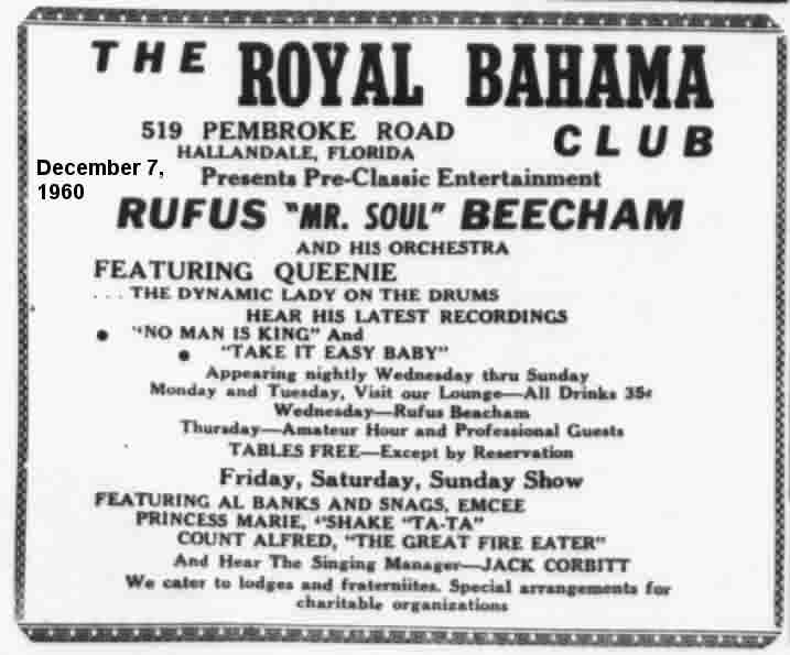 In early December, "Rufus 'Mr. Soul' Beecham and his Orchestra, featuring Queenie the dynamic lady on the drums" appeared at the Royal Bahama Club in Hallandale, Florida. The December 7 ad said they'd be there "nightly Wednesday thru Sunday" (although it also said "Wednesday - Rufus Beacham"). That was the only ad I could find for the club itself.
