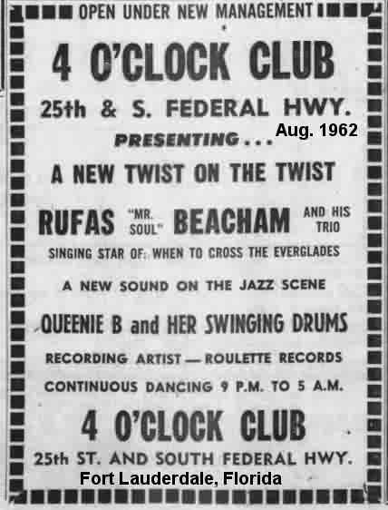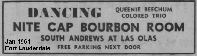 The January 19, 1961 Fort Lauderdale News said: "Fred Whalen says he has a real knockout at his Nite Cap lounge. The downtown spot, on S. Andrews Ave., at Las Olas, is featuring Queenie Beecham and her trio." Since there was never another mention of Queenie having her own trio, it's probably Rufus and company.