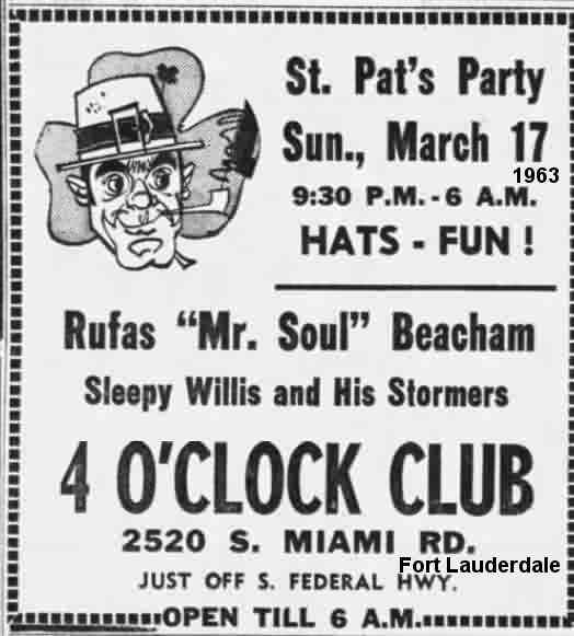 "Rufas 'Mr. Soul' Beacham" was back at the 4 O'Clock Club in Fort Lauderdale in early February 1963. Still misspelled, he was advertised for their St. Pat's Party on March 17. Right after that, it was Porky's, also in Fort Lauderdale. His band was advertised on March 31.