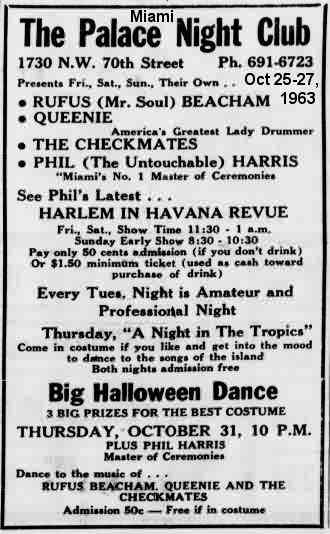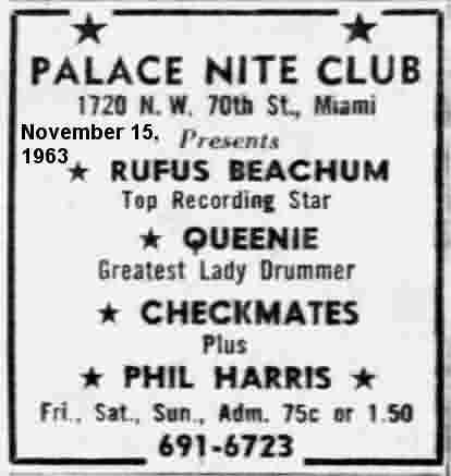 Rufus (Mr. Soul) Beacham and Queenie (America's Greatest Lady Drummer) were at the Palace Night Club in Miami from October 25-27, 1963. On November 15, they were back (or had never left - there just aren't enough ads to be sure). This time he was "Rufus Beachum - Top Recording Star").