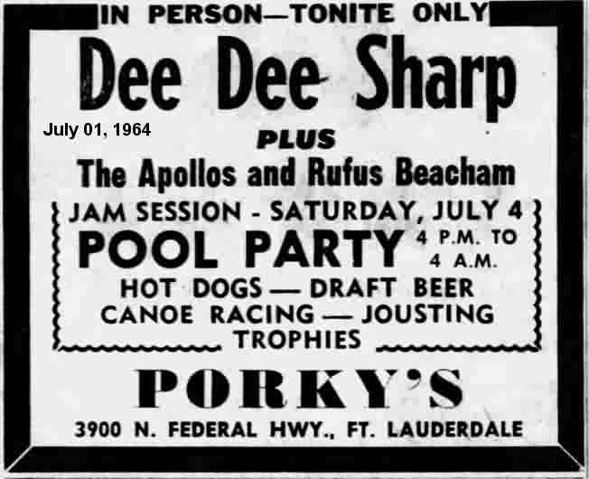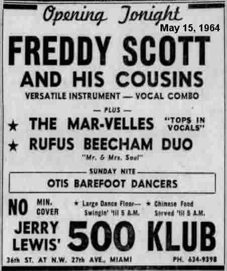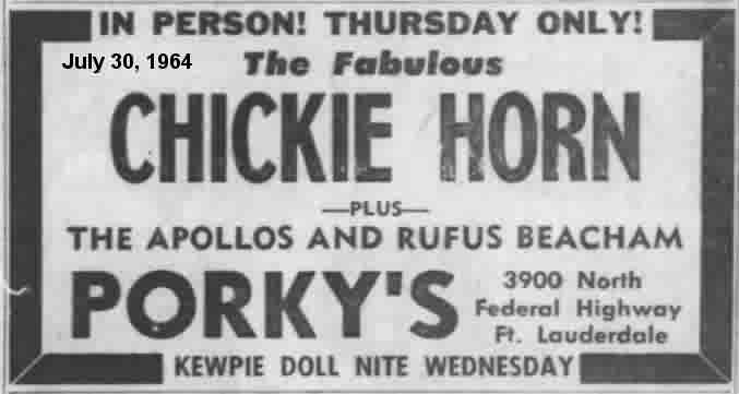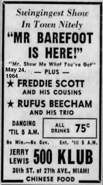 On May 5, 1964, "Rufus Beecham And His Trio" were at the 500 Klub in Miami; however, only ten days later, their May 15 ad talked about the "Rufus Beecham Duo - 'Mr. & Mrs. Soul'". Then, by May 24, the ad once again had them as a trio. After that, Rufus played Porky's in Fort Lauderdale the whole month of July 1964. Others who appeared during the month were Dee Dee Sharp, Sam & Dave, and, of course, "The Fabulous Chickie Horn". The ads didn't say if Rufus was by himself.